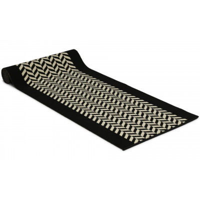 Avenue är en trapp- och gångmatta på metervara i mycket hög kvalitet. Ovansidan av mattan är i 80% ull vilket gör att mattan är tålig och slitstark. Avenue finns i flera varianter med olika mönsterbilder. Här ser du Aveune i en variant med fiskbensmönster som går i svart och vitt. Längs långsidorna är det en svart bård som ramar in mattan.Mattan kantas bara på kortsidorna. Långsidorna levereras med befintlig stadkant.