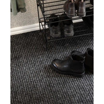Kangos är en entrématta på metervara som ger dig en funktionell entré. Ovansidan har ett skrapmönster som effektivt samlar upp smuts och grus, och som skyddar dina golv från blöta skor och slitage. Baksidan är gummerad vilket gör att mattan ligger stabilt på golvet. Här är Kangos i färgen svart.
