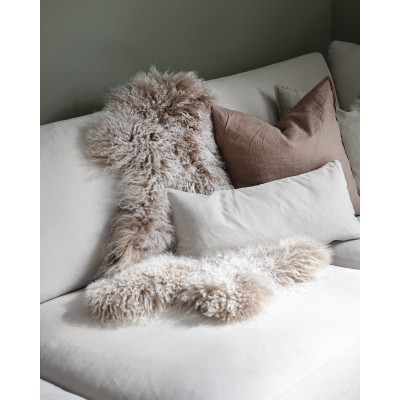Shansi är ett mjukt och härligt långhårigt och smålockigt fårskinn från Tibet. Här ser du Shansi i färgen beige snowtop.