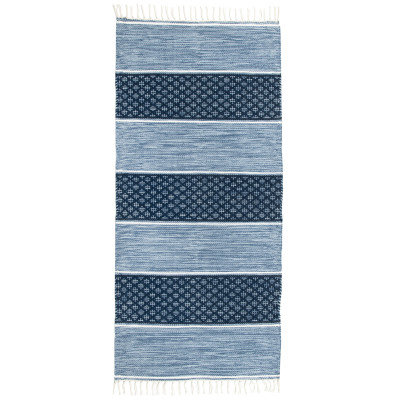 Visby är en handvävd trasmatta av mycket fin kvalitet. Mattan är randig med ett snyggt rombmönster, och med en klassisk frans längst med kortsidorna. En snygg och slitstark inredningsdetalj som passar i alla hem. Här är Visby i färgen blå.